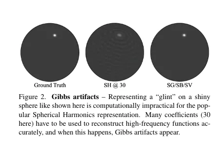しかし、この方法ではより高周波なシグナルを表現しようとすると SH の次数を上げる必要があり、大量のパラメータが必要になります。 現実的なパラメータ数を使うと高周波なシグナルを表現するのが難しくぼやけたようなシグナルしか表現できない、という問題があります。