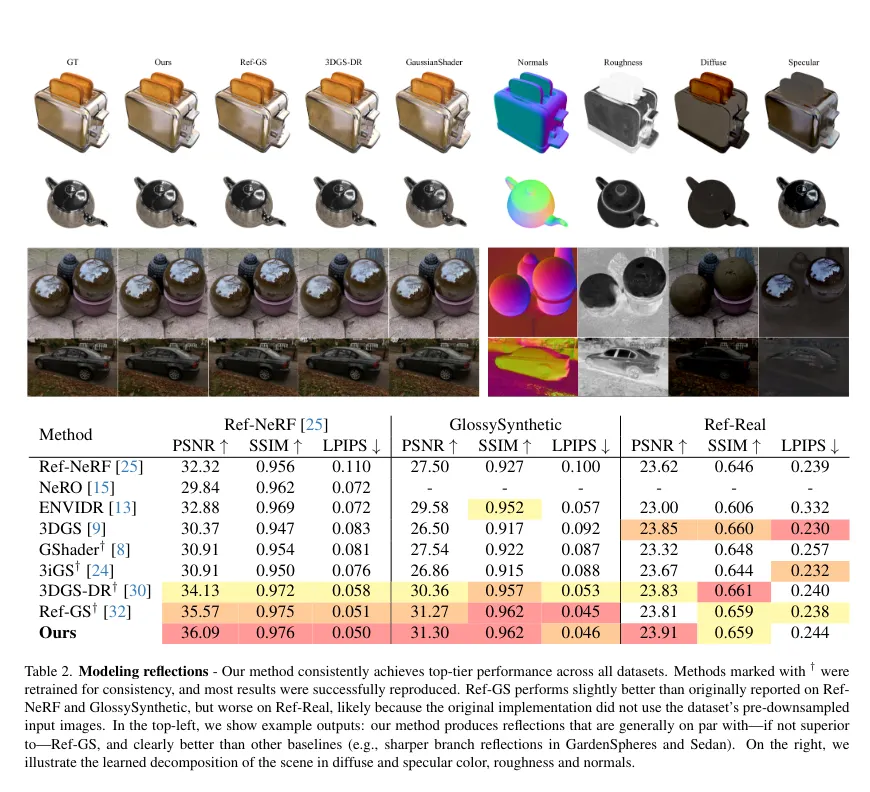 特に、おなじ 2DGS をバックボーンとする Ref-GS を僅かに上回っており、Ref-GS は MLP デコーダーを利用しているがこの論文の手法は explicit な手法であるという点が特筆すべき。