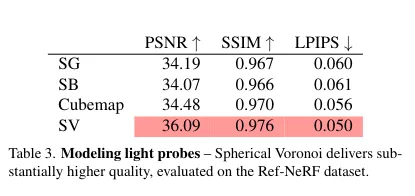 2 つ目の実験のように反射ベースの GS では deferred shading のための 2 パスのレンダリングが必要だったり、最近傍の SV をクエリし補間するのにコストが発生するためオーバーヘッドがある。 そのためオリジナルの 3DGS よりは 0.45 倍の速度になっているとのこと。 ただし、反射ベースのモデリングの SOTA の Ref-GS よりは高速であるとのこと。